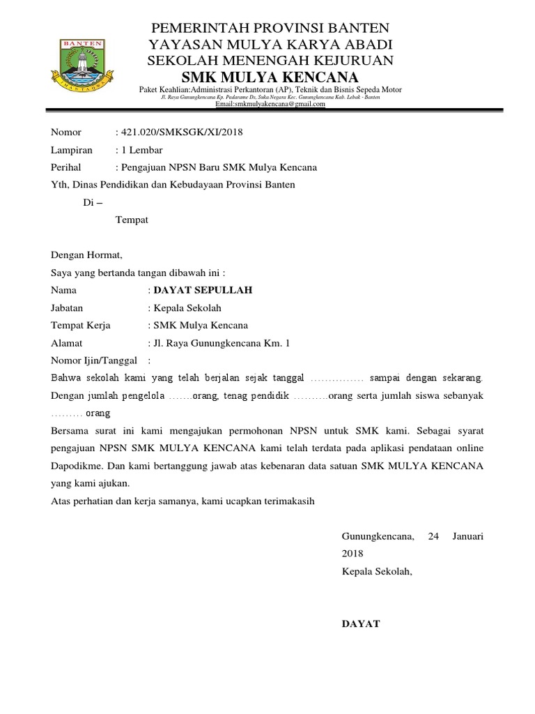 Contoh surat permohonan pengajuan npsn. Satuan pendidikan yang diajukan untuk mendapatkan npsn harus yang sudah memiliki izin operasional dan terdata di aplikasi pendataan online paudni. Kemungkinan jenis surat permohonan yang akan kamu buat atau kamu urus berbeda tapi tidak usah bingung kamu cukup menyesuaikannya dengan contoh yang kami berikan di atas. Download contoh berkas pengajuan npsn. Anda bisa mengisi surat pengajuan dengan permintaan pindah tugas permohonan izin sampai dengan permintaan bantuan dari pihak lain untuk seseuatu hal misalnya. Pengajuan atau permohonan bisa dibuat oleh bawahan kepada pimpinan ataupun antar instansi dan kantor. Npsn dengan menggunakan format surat dan daftar pengajuan npsn baru terlampir.