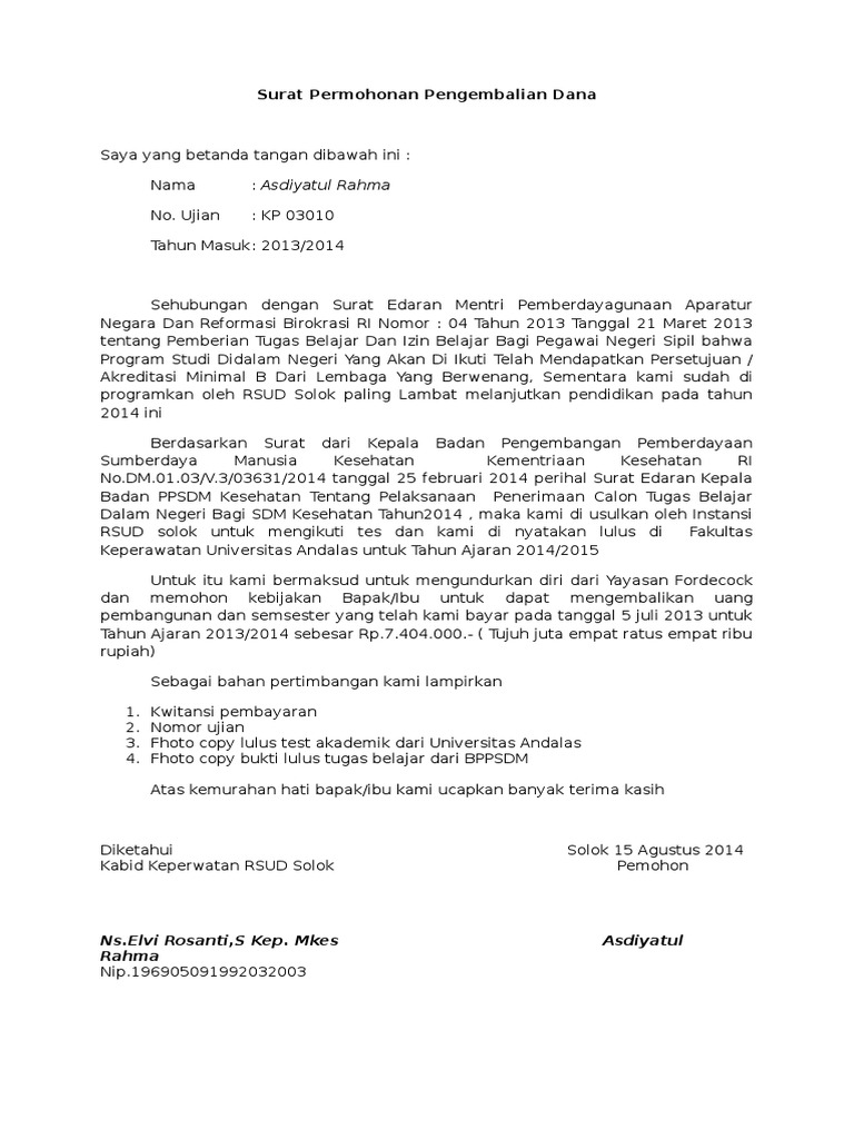 Contoh surat permohonan pengembalian dana. Surat pernyataan kehilangan dokumen asli. Untuk mengatasi masalah sumber dana ini dapat dilakukan dengan iuran antaranggota. Surat juga menunjukkan penghormatan kepada orang yang ditujukan. Surat permohonan adalah surat yang berisi permintaan atau permohonan secara resmi kepada seseorang badan instansi atau perusahaan. Contoh surat permohonan kerjasama kepada suatu perusahaan. Salah satu faktor yang biasanya sering menjadi kendala adalah masalah yang berkaitan dengan finansial atau sumber dana.