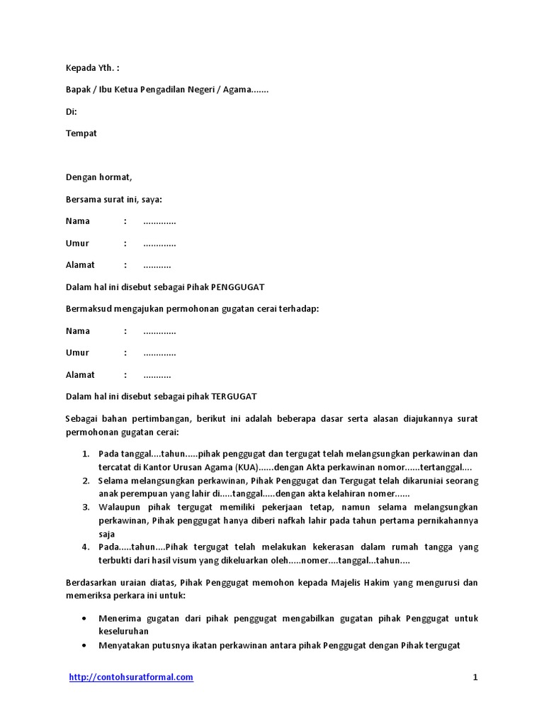 Mengajukan perceraian sah sah saja bagi perempuan apabila anda merasa sudah terancam kedamaian hidupnya misalnya anda dianiaya sudah tidak di nafkahi atau suami melanggar janji pernikahan dengan anda. Yha apabila selalu terjadi hal hal yang tidak baik dalam pernikahan solusi terakhir adalah perceraian. Ada banyak alasan yang mengharuskan sepasang suami istri untuk bercerai dan berpisah tergantung dari permasalahan keluarga masing masing. Contoh surat permohonan gugatan perceraian contoh surat permohonan cerai talak oleh suami. Contoh surat kuasa untuk perceraian wednesday 14th september 2016 11 41. Jika anda berniat untuk mengajukan gugatan lain seperti hak asuh anak secara bersama sama dengan surat gugatan silahkan buka contoh surat gugat cerai disertai gugat hak asuh anak.