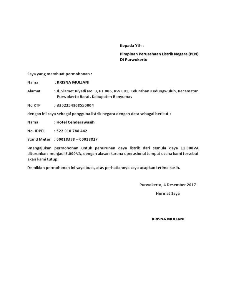 Detail alamat bagunan 3. Maka saya berkeinginan untuk menurunkan daya listrik dengan id pel. Admin blog bagikan contoh 2019 juga mengumpulkan gambar gambar lainnya terkait contoh surat permohonan penambahan daya listrik doc dibawah ini. Terima kasih telah berkunjung ke blog berbagi contoh. Contoh surat permohonan turun arus daya listrik kepada yth bapakibu pt. Langkah mudah ajukan tambah dan turun daya listrik pln.