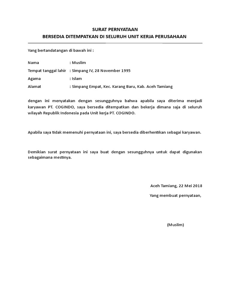 Sebagai pegawai negeri sipil sudah menjadi tugas dan kewajibannya harus mau ditempatkan di mana saja dan diposisi apa saja. Contoh surat pernyataan siap ditempatkan dimana saja cpns. Sebenarnya isi informasi pada surat pernyataan untuk bersedia ditempatkan di seluruh skpd jika dibandingkan dengan kasusku maka telah tercantum pada surat jawaban persetujuan mutasi pns dari instansi yang dituju. Admin blog bagi contoh surat 2019 juga mengumpulkan gambar gambar lainnya terkait surat keterangan bersedia ditempatkan dimana saja dibawah ini. Pada artikel sebelumnya saya telah memberikan contoh surat lamaran cpns kemenag dan surat pernyataan bebas narkoba. Dengan ini menyatakan dengan sesungguhnya bahwa saya bersedia mengabdi pada satuan kerja di kementerian agama dan tidak akan mengajukan pindah.