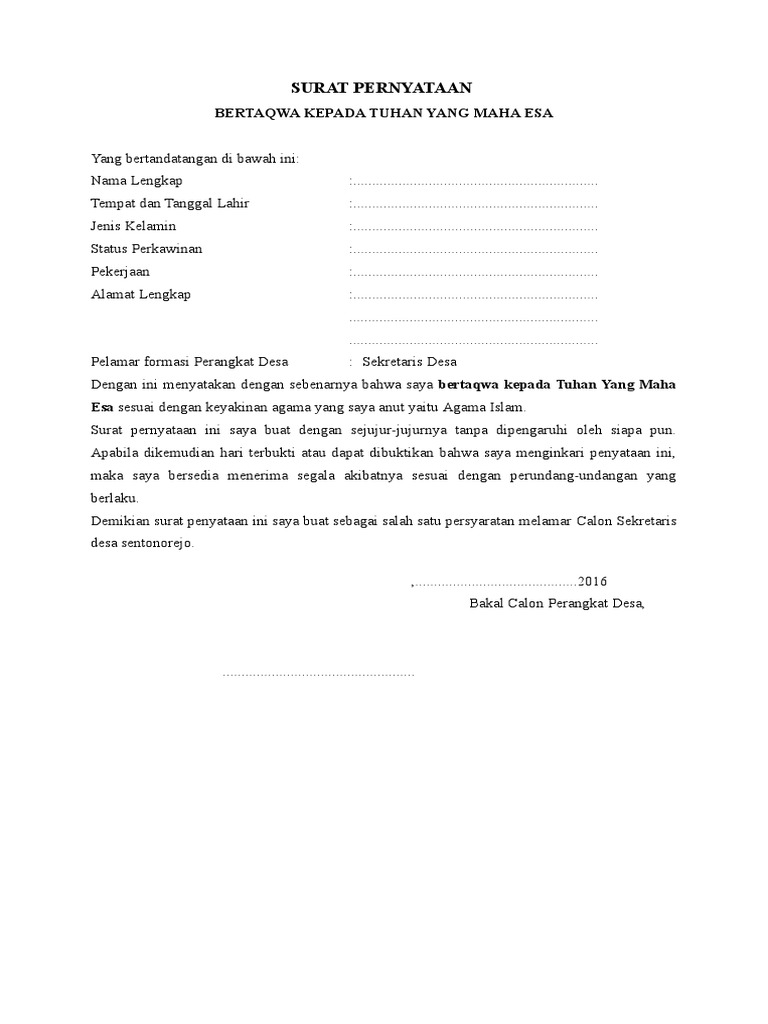 Khususnya bagi anda yang membutuhkan surat pernyataan itu dalam konteks persyaratan pilkades maupun persyaratan administrasi di bidang lainnya. Semua hal tersebut diatas silahkan cocokkan dengan biodata penduduk anda yang sesuai dengan e ktp atau kartu keluarga. Demikian ulasan contoh surat pernyataan bertaqwa kepada tuhan yang maha esa yme calon kepala desasemoga contoh format surat pernyataan tersebut dapat bermanfaat untuk anda semua. Menyatakan dengan sebenarnya bahwa saya bertakwa kepada tuhan yang maha esa sesuai agama yang saya anut. Apa fungsi surat pernyataan bertaqwa kepada tuhan yang maha esa cara membuat surat pernyataan bertaqwa kepada tuhan yang maha esa bukti pernyaataan bahwa setia kepada pancasila sila pertama persyaratan melamar menjadi pegawai pemerintah kelurahan desa pns contoh surat pernyataan bertaqwa kepada tuhan yang maha esa kelurahan desa saya bertaqwa kepada tuhan yang maha esa sesuai agama dan. 81 tahun 2016 tentang persyaratan pengangkatan perangkat desa.