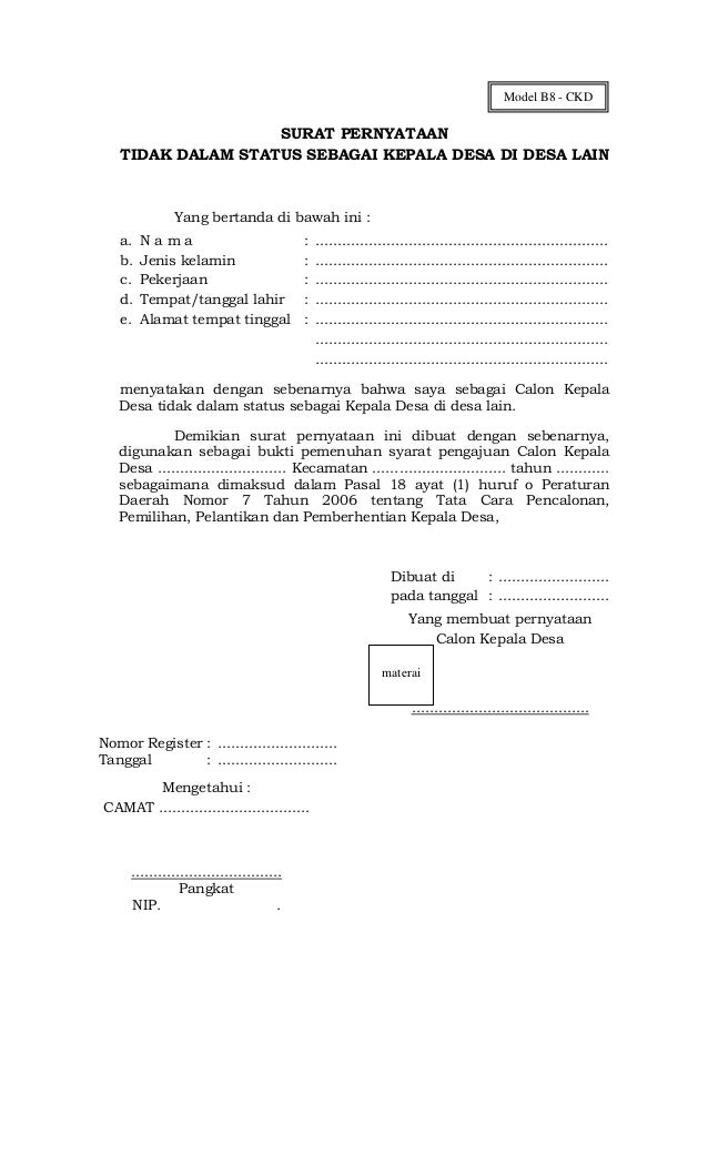 Contoh surat pernyataan calon kepala desa. Surat pernyataan bertaqwa kepada tuhan yang maha esa surat pernyataan memegang teguh dan mengamalkan pancasila undang undang dasar republik indonesia tahun 1945 memelihara keutuhan negara kesatuan republik indonesia surat keterangan bertempat tinggal di desa paling kurang 1 satu tahun sebelum pendaftaran dari rtrw dan kepala desa. Surat pernyataan calon kades 2019 adalah surat yang dibuat atau yang dibutuhkan bagi seseorang yang mencalonkan diri sebagai bakal calon kepala desa baik dalam desa itu sendiri atau dari desa lain untuk mengikuti pencalonan sebagai calon kepala desa di tahun 2019 dan bagi calan petahana atau incumben yang mau mengikuti pencalonan kembali asal belum pernah menjabat sebagai kepala desa selama 3. Contoh surat pernyataan bersedia dicalonkan persyaratan melamar pekerjaan melamar pns. Membimbing demi sukses nya kepala desakampong sikalondang 2016 2022 dan kelancaran berdemokrasi perlu kira pembentukan. Bahwa setiap yang mengikuti calon kepala desakampong sebagai mana di atur dalam ketentuan peraturan dan ketentuan tentang pedoman tekhnis tata cara pencalonan pemilihan umum kepala desakampong. Karena itu surat lamaran ini biasa juga disebut form permohonan pendaftaran pencalonan kepala desa.