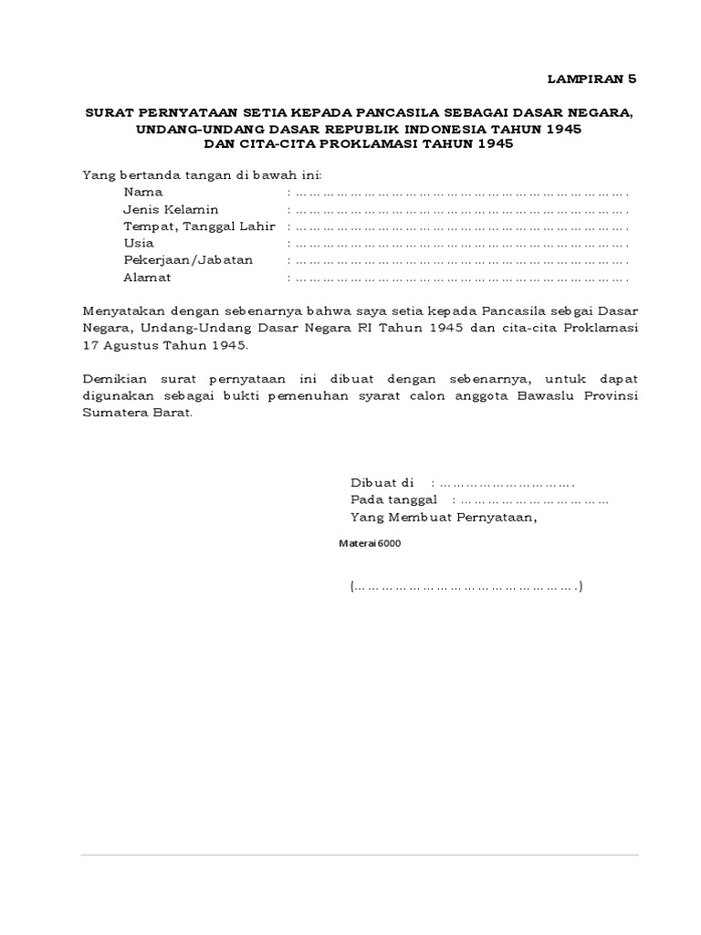 Contoh surat pernyataan setia kepada pancasila. Contoh surat lamaran calon panwas panita pengawas lapangan ppl contoh surat lamaran untuk menjadi panitia pengawas lapangan ppl pada panitia pengawas panwas pemilihan panwaslih panwaslu kecamatan xxxxx di pemilihan kepala daerah. Anda dapat melihat dengan jelas contoh surat pernyataan setia kepada pancasila menggunakan desktop anda tablet android atau iphone dan perangkat smartphone lainnya secara gratis. Contoh surat pernyataan setia kepada pancasila adalah gambar contoh surat berdefinisi tinggi dan memiliki ukuran 768x1024. Setia kepada pancasila sebagai dasar negara undang undangdasar negara republik indonesia tahun 1945. Semoga contoh surat di atas bermanfaat. Surat pernyataan setia dan taat kepada pancasila sebagai dasar negara uud 1945 nkri pemerintah dan desa adalah surat yang biasanya dibuat dengan tujuan untuk melengkapi persyaratan mencalonkan segala sesuatu yang berhubungan dengan kepemimpinan.