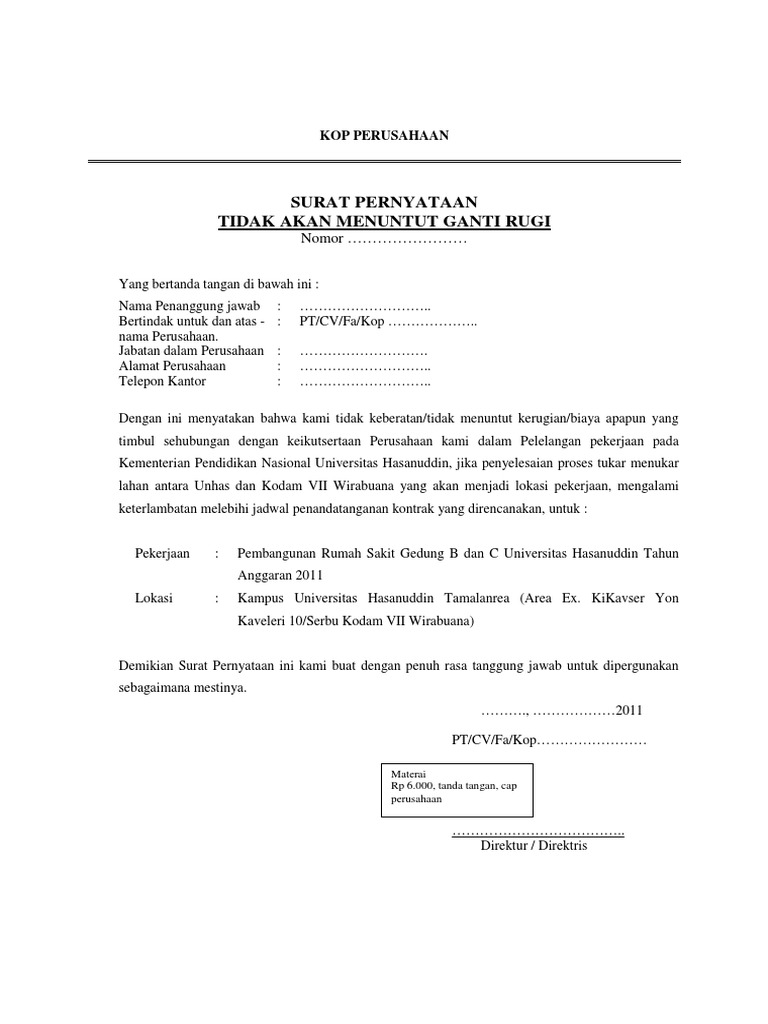 Selain contoh ganti rugi yang berhubungan dengan sewa rumah dan kecelakaan surat pernyataan bersedia membayar ganti rugi dibawah ini bisa dimodifikasi untuk mengganti kerugian yang diakibatkan misalnya. Tidak akan menuntut ganti rugi dalam bentuk apapun kepada panitia pelaksanaan pekerjaan satker bpks apabila dalam proses pelelangan dan pelaksanaan pekerjaan adanya kebijakan pemerintah republik indonesia tentang perubahan perubahan atau pergeseran alokasi biaya tahun anggaran 2017 atau adanya hal yang tidak memungkinkan untuk dilanjutkan pelelangan ataupun pekerjaan yang sedang berjalan.
