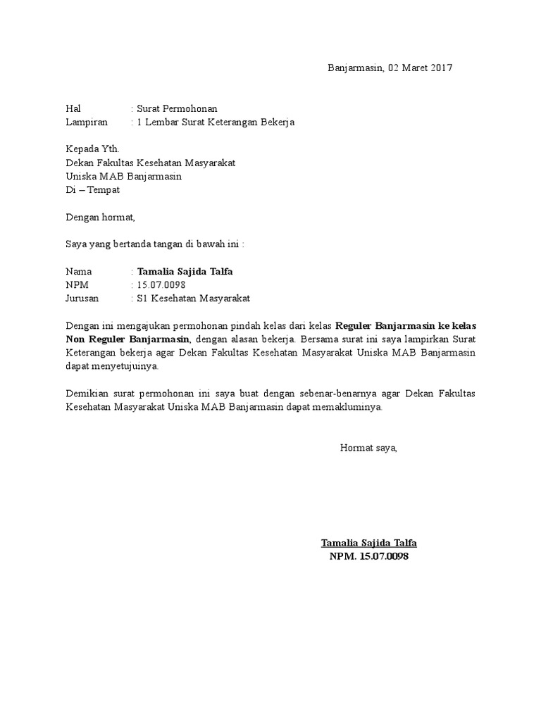 Demikian surat permohonan ini saya ajukan dan atas perhatian bapakibu saya me3ngucapkan terima kasih. Berikut ini anda bisa lansung copypaste contoh surat permohonan pindah sekolah. Sertakan juga identitas orang tua siswa. Tanjungpinang 1 oktober 2012. Guru pun bisa membuat permohonan ke dinas pendidikan setempat ataupun pihak yang membidangi. Dengan ini saya mengajukan permohonan pindah kuliah dari kelas regular ke kelas week end.