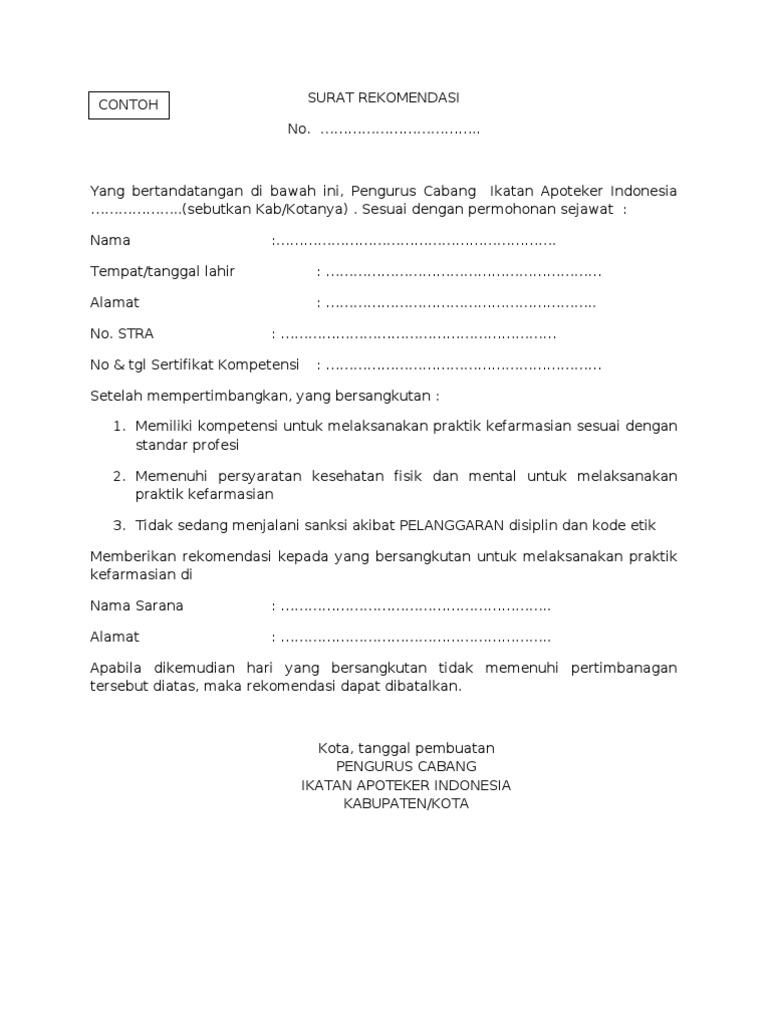 Contoh surat rekomendasi apoteker untuk pembuatan strttk. Memperoleh surat rekomendasi pafi untuk strttk sikttk berdasarkan surat pengurus pusat pafi no. Strttk bagi pemohon rekomendasi sikttk ktan pafi bukti pembayaran perolehan surat rekomendasi strttk sikttk kirim hasil scan ke email. O surat rekomendasi kemampuan dari apoteker yang telah memiliki stra. Membaca ataupun menulis email mulailah belajar dari teman teman yang telah bisa. Sekretariat at pafi bloginfo konfirmasikan hanya untuk sms dgn menyebut identitas ke 089688625447 an dhony surat rekomendasi yang telah selesai akan dikirim ke email pemohon. Karena namanya juga syarat pasti harus ada dong dan terkadang dari pihak tempat kerja baik dokter balai pengobatan atau di apotek sendiri malah disuruh buat sendiri pimpinan hanya tinggal tanda tangan.
