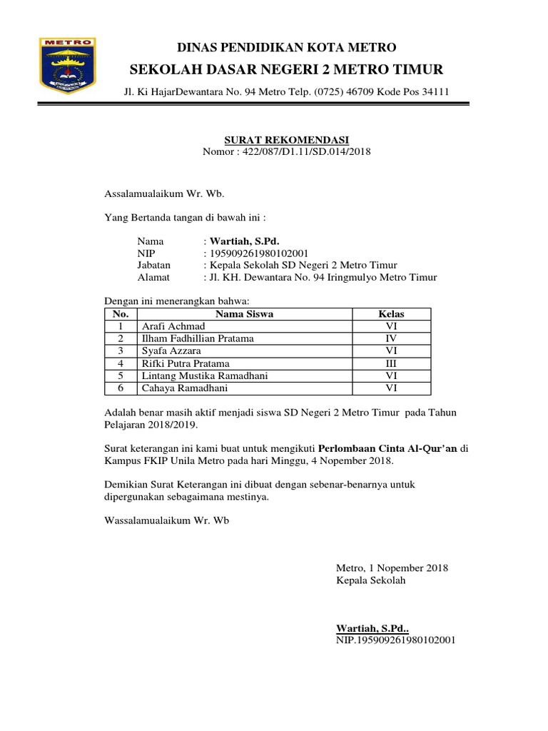 Salah satu contoh yang paling mudah kita temukan adalah surat rekomendasi beasiswa dari kepala sekolah untuk siswanya. Surat rekomendasi sekolah untuk siswa surat rekomendasi kepala sekolah yang bertanda tangan di bawah ini kepala sma negeri 2 kota pekanbaru.