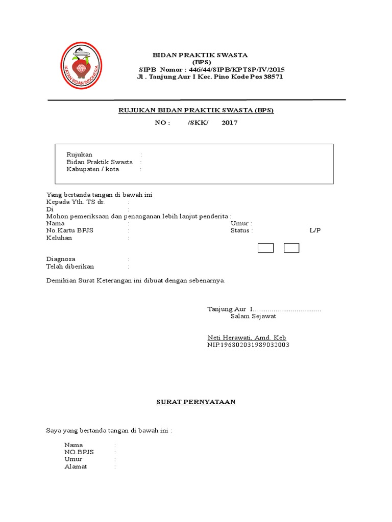 Di klinik contoh surat lamaran bidan ke puskesmas contoh surat lamaran. Fungsi bidan salah satunya adalah melakukan skirining terhadap adanya komplikasi kehamilan agar dirujuk untuk mendapatkan perawatan khusus dari dokter spesialis. Berbagi ke twitter berbagi ke facebook bagikan ke pinterest. Sistem rujukan upaya kesehatan adalah suatu sistem jaringan fasilitas pelayanan kesehatan yang memungkinkam terjadinya penyerahan tanggung jawab secara timbal balik atas masalah yang timbul baik secara vertikal maupun horizontal. Contoh surat rujukan bps as syifa. Ke rumah sakit surat.