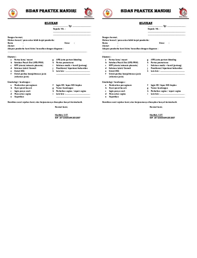 Contoh surat rujukan bidan. Mahasiswa s2 biomedik fakultas kedokteran unissula contact. Sangat banyak contoh surat lamaran kerjaan bidan yang bisa jadikan rujukan. By banksurat contoh surat rujukan contoh surat rujukan bidan contoh surat rujukan dokter tata cara rujukan contoh surat surat rujukan adalah surat pengantar tenaga medis dalam hal ini ditujukan kepada dokter maupun dokter gigi secara tertulis yang bertujuan sebagai advice petunjuk pengobatan maupun pengobatan secara lebih lanjut kepada tenaga medis yang lebih berkompeten dalam bidangnya. Mohon maaf apabila terdapat kesamaan namatempatinformasi lain karena surat yang dibuat hanya bertujuan sebagai percontohan tanpa ada maksud apapun. Demikian surat rujukan ini kami kirim kami mohon balasan atas surat rujukan ini. 28 tahun alamat.