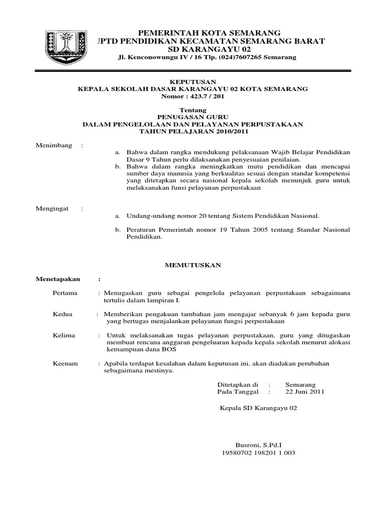 Seorang atasan bisa saja memberikan surat perintah dinas kepada para bawahannya. Demikianlah surat tugas ini diberikan agar dapat dilaksanakan dengan sungguh sungguh dan penuh rasa tanggung jawab. Dalam lingkup organisasi sekolah pimpinan sekolah atau kepala sekolah memiliki wewenang dalam memberikan surat keputusan sk berkaitan dengan seluruh kepentingan sekolah.