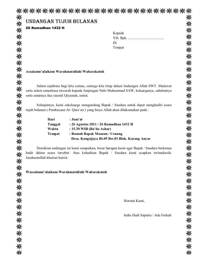 Perlu diingat dalam pembuatan surat undangan harus lengkap supaya pihak yang diundang paham dan merasa penting untuk hadiri. Contoh undangan syukuran aqiqah walimatul tasmiyah kepada kepadayth. Contoh surat undangan pengajian 4 bulanan contoh isi undangan. Contoh surat undangan syukuran 4 bulanan. Doa pengajian empat bulanan. Informasi undangan yang kami bagikan semoga menjadi informasi terbaik dan bisa benrmanfaat untuk semua khususnya informasi tentang contoh surat undangan 4 bulanan doc terbaru 2020 yang semuanya kami kumpulkan dengan serapih mungkin.