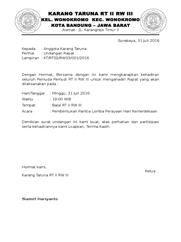 Contoh surat undangan pembentukan karang taruna. Surat undangan dengan tujuan rapat karang taruna merupakan salah satu surat resmi karena pada surat undangan rapat terdapat ada kepala surat dan berstempel organisasi. Admin blog kumpulan surat penting 2019 juga mengumpulkan gambar gambar lainnya terkait contoh surat undangan pembentukan karang taruna dibawah ini. Contoh surat undangan rapat anda tentu pernah menghadiri sebuah acara rapat entah rapat rt rapat karang taruna rapat acara kepanitiaan rapat dengan klien di perusahaan rapat direksi dan lain lain. Contoh surat udangan rapat karang taruna kalau anda saat ini ada niat untuk memberikan kepada teman teman anda untuk menghadiri rapat karang taruna untuk bisa memelihara kampung anda dan memberikan kegiaatan bagi para pemudah kartar maka kami sampaikan disini untuk undangan rapat karang taruna tersebut untuk bisa anda hadirkan kepada teman teman untuk menghadiri karang taruna tersebut untuk. Itulah contoh surat undangan pembentukan karang taruna yang dapat admin kumpulkan. Contoh surat undangan musyawarah dan pembentukan kepengurusan karang taruna desa berikut ini adalah contoh dari contoh surat undangan musyawarah dan pembentukan kepengurusan karang taruna desa seperti surat contoh dibawah ini.
