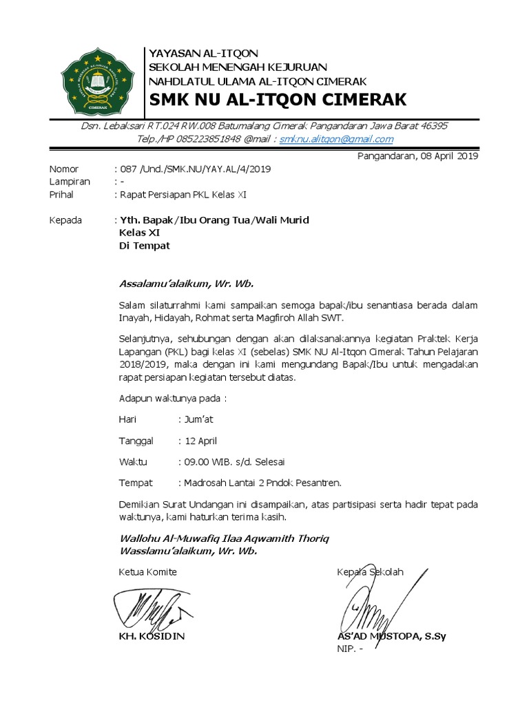 Untuk itu maka pihak sekolah bisa menggunakan surat undangan. Salah satu surat resmi yang sering dibuat oleh pihak sekolah adalah surat undangan orang tua atau wali siswa diantaranya untuk menghadapi kenaikan kelas sekaligus pembagian raport atau untuk menghadapi salah satu acara yang diadakan oleh pihak sekolah dengan orang tua atau. Pihak sekolah biasanya akan memberikan surat undangan kepada orang tua siswa melalui siswa yang bersangkutan. Didalam surat undangan rapat wali siswamurid harus disertakan tujuan tanggal dilaksanakan waktu pelaksanaan dan dimana dilaksanakanya. Didalam surat undangan rapat wali siswamurid harus disertakan tujuan tanggal dilaksanakan waktu pelaksanaan dan dimana dilaksanakanya. Yang terhormat bapakibu wali murid kelas vii smp n 1 ronggo di tempat dengan hormat berdasarkan hasil rapat orang tua wali pada tanggal 10 januari 2018 yang lalu smp n 1 ronggo tahun ajaran 20172018 akan mengadakan acara study tour yang wajib diikuti oleh seluruh siswa kelas vii.