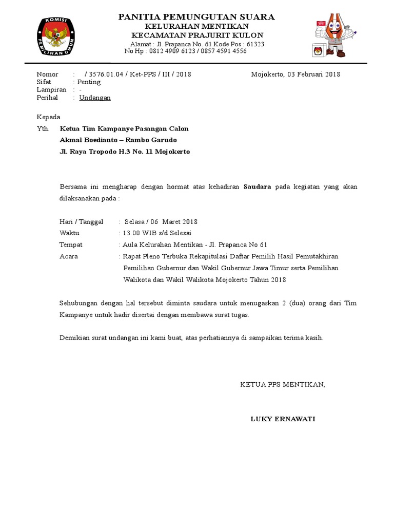 Contoh surat undangan rapat pleno pps. Ahmad yani no 89 pagaden nomor lampiran perihal. Diberitahukan dengan hormat bahwa sehubungan akan dilaksanakannya rapat pleno rekapitulasi hasil penghitungan suara pemilihan gubernur dan wakil gubernur jawa barat tahun 2013 bersama ini kami mengundang kepada bapakibu untuk hadir dalam acara. Surat undangan berarti surat yang secara resmi dibuat untuk menghadirkan atau mengundang para peserta dalam hal ini adalah undangan bimbingan teknis. Surat undangan rapat pleno penetapan dpshp dengan ini disampaikan kepada kpu kabupatenkota surat nomor 184kpu prov026viii2013 tanggal 16 agustus 2013 tentang rapat pleno penetapan dpsh. Contoh surat undangan rapat bagi anda yang berkecimpung dalam dunia organisasi pendidikan maupun yang bekerja di perusahaan pasti sudah tidak asing lagi dengan kegiatan rapat. Sepertia pada kesempatan sebelumnya dikesempatan ini kami juga akan membahas informasi seputar berbagai contoh surat yang akan kami bahas dikesempatan ini tentang kumpulan contoh surat undangan rapat yang benar bagi anda yang ingin mengetahui seperti apa seh cara.