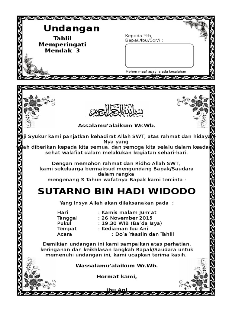 Untuk membuat contoh surat undangan tahlil 40 100 1000 hari haul ini lebih menarik ts udah nambahin border dan sedikit hiasan di sudutnya cek preview nya gan. Contoh surat undangan tahlilan tahlilan adalah salah satu agenda keagamaan yang khusus merayakan kematian seorang muslim di masyarakat indonesia.