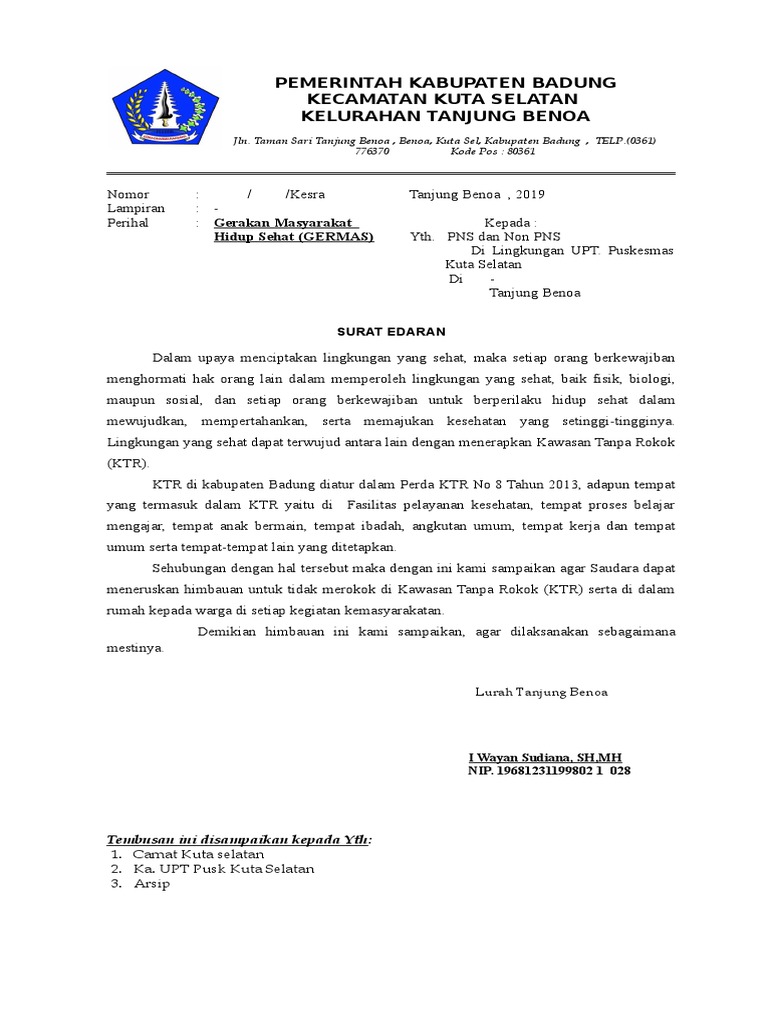 Antam menegaskan pentingnya reformasi birokrasi untuk mendorong pertumbuhan ekonomi khususnya saat pandemi. Untuk itu bupati giri prasta juga telah menerbitkan surat edaran bupati badung nomor 259 tahun 2020 tentang panduan stakeholder kepariwisataan kabupaten badung menuju new normal serta keputusan bupati badung no197041hk2020 tentang pembentukan tim verifikasi kesiapan tata kelola pariwisata pasca pandemi corona virus disease 2019 untuk melaksanakan verifikasi terhadap pengelola objek. Gelontorkan rp 23 m untuk free wifi bupati badung terapkan smartcity. 10 views dalam sebulan 1 kk masyarakat kita bisa menghabiskan biaya rp. Contoh surat permohonan kepada bupati untuk bantuan beasiwa dapat kamu unduh secara gratis dan lengkap melalui link di bawah ini. 15 contoh surat undangan resmi pemerintahan perusahaan organisasi dll jenis surat ada dua macam yakni surat resmi dan surat tidak resmi.